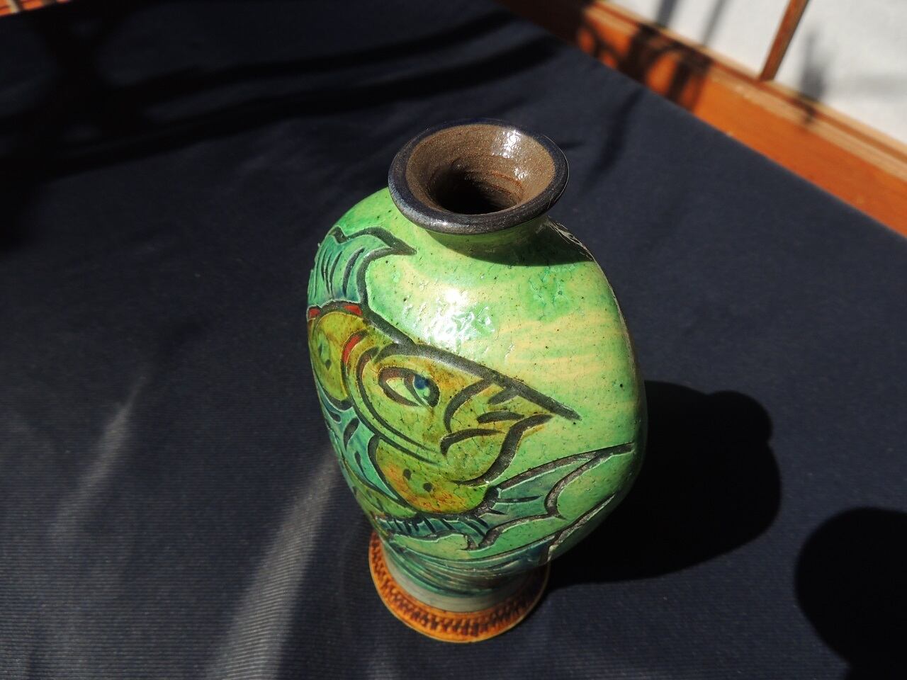 沖縄独特の線彫りの魚紋に外側に緑上絵、魚に赤絵を施し豪華な雰囲気の偏壺となります。