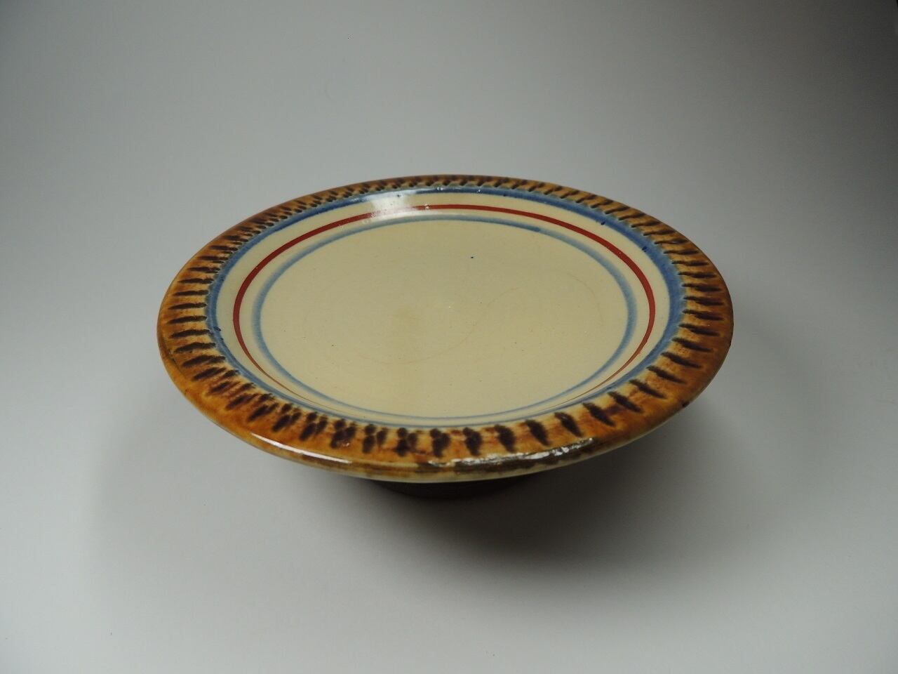 沖縄独特かつ伝統の飛び鉋に伝統の飴釉、更には赤絵を施した高付き高台の使いやすい4寸のお皿になります。